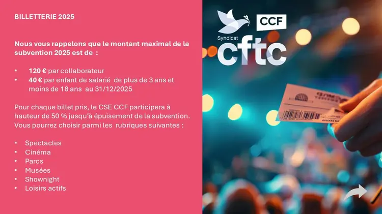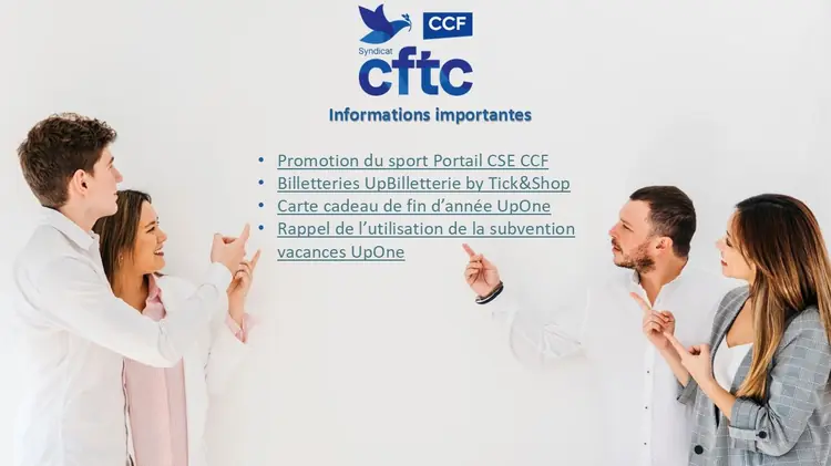 L'équipe CFTC CCF a le plaisir de partager avec vous les dernières informations sur les Activités Sociales et Culturelles (ASC) du CSE ainsi que les actualités RH relatives à l'abondement du PEE et à la monétisation du CET.