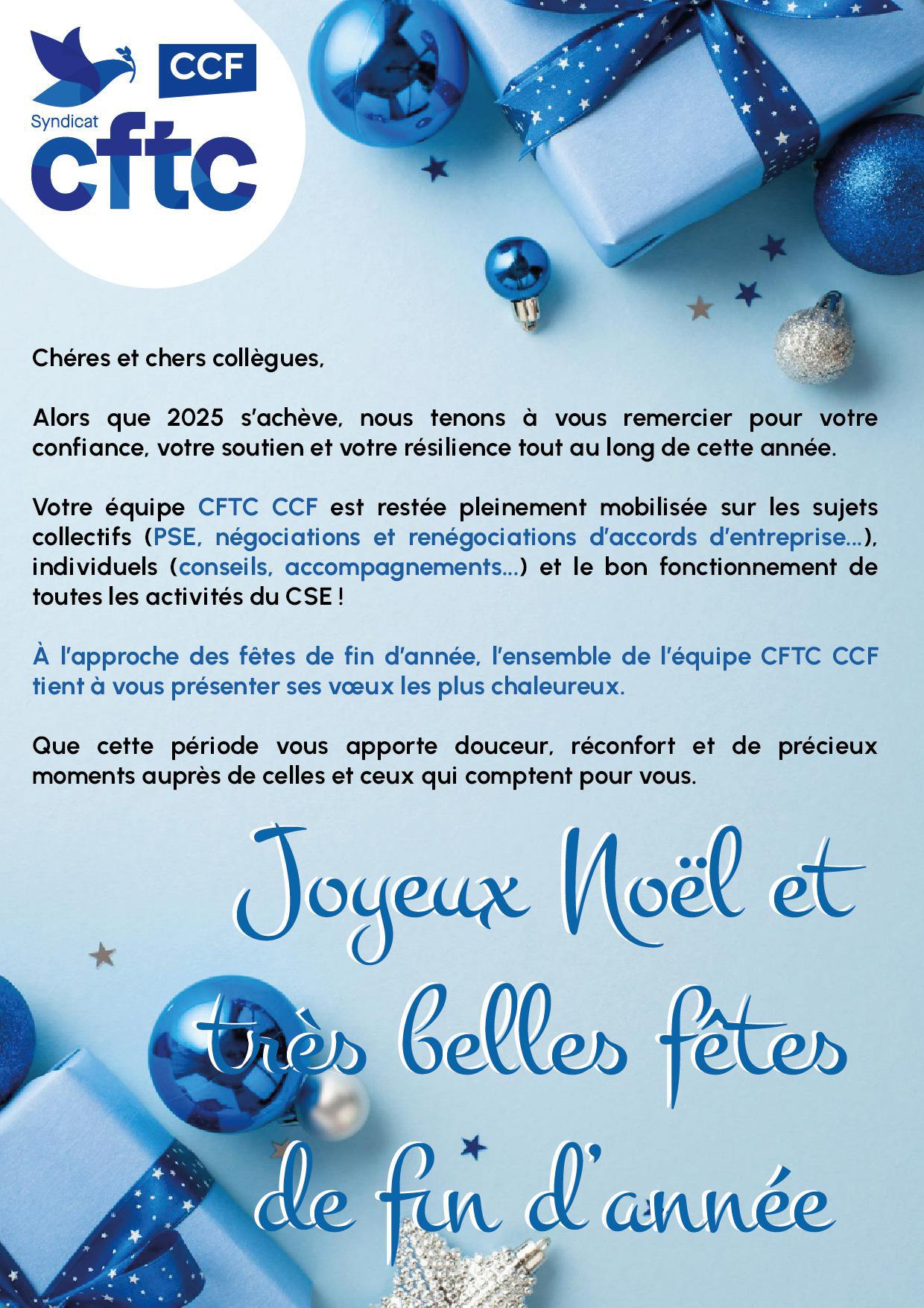 À l’approche des fêtes de fin d’année, l’ensemble de l’équipe CFTC CCF tient à vous présenter ses vœux les plus chaleureux.